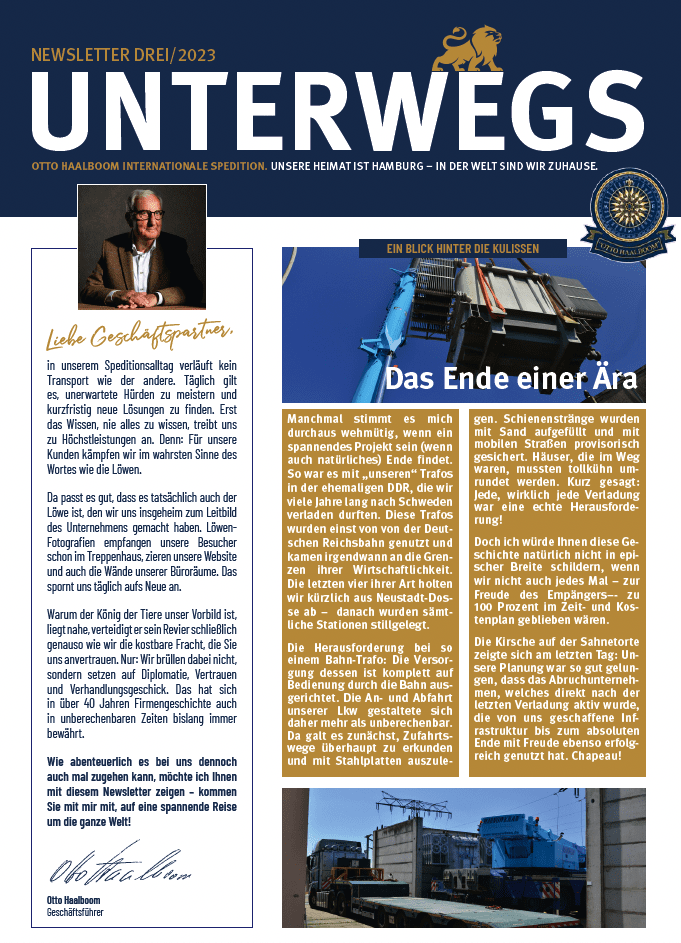 In this issue, you will find out why the lion, the king of beasts, is our secret guiding principle and source of inspiration. We report on our adventurous transports and how we face the challenges of our industry with diplomacy, trust and negotiating skills. We also take a look at an important chapter in our company history – the end of an era in the history of transformer transport.